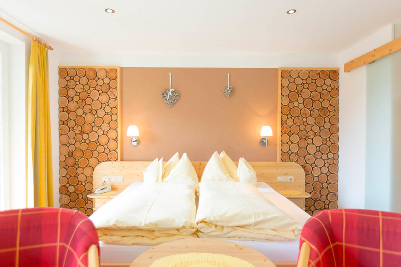 Ab Sommer 2015 ziert zusätzlich eine Zirbenwand mit Zirbenscheiben aus dem "Oberhauser Zirbenwald" unsere Superior-Zimmer.