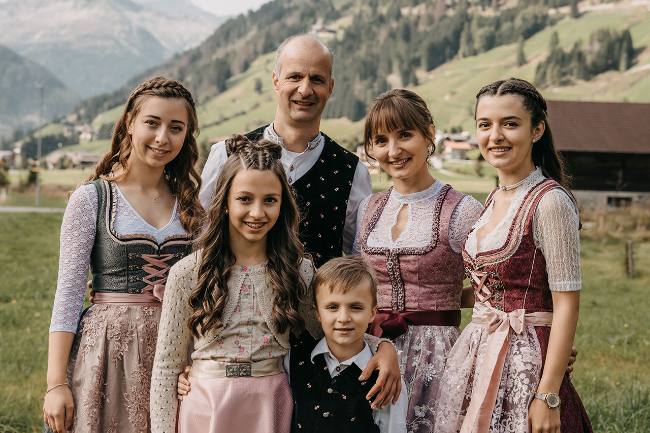 Hannes und Cornelia mit Lena, Lisa, Hannah und Johannes haben das Hotel Garni Grünmoos 2006 von den Seniorchefleuten, Maria und Matthias Erlsbacher übernommen.
